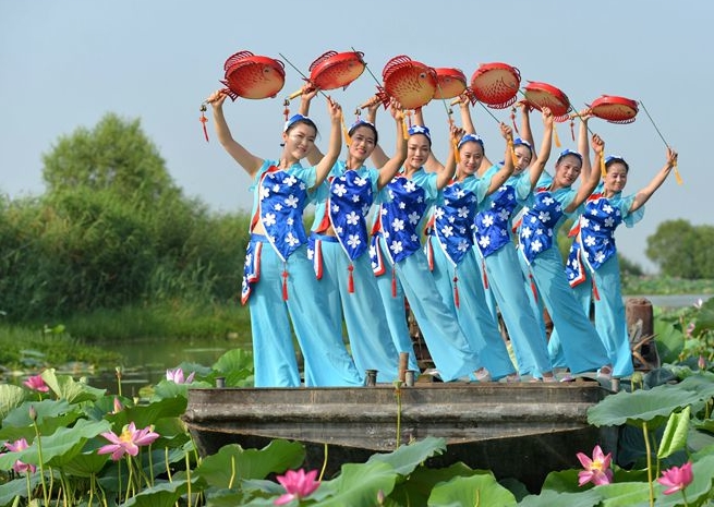 Hongze Lake Fishing Drum Dance is one of the state-level intangible cultural heritages. It was a kind of folk dance around Hongze Lake, performed for some sacrificial rites at the early time. Later, dance artists did a lot of study and made adaptation of Hongze Lake Fishing Drum Dance. Many dance movements derived from actions of fishing, such as weaving fishing nets, tying hooks and pulling nets, portraying the image of working fishermen. The photo above shows Fishing Drum dancers performing on Hongze Lake.